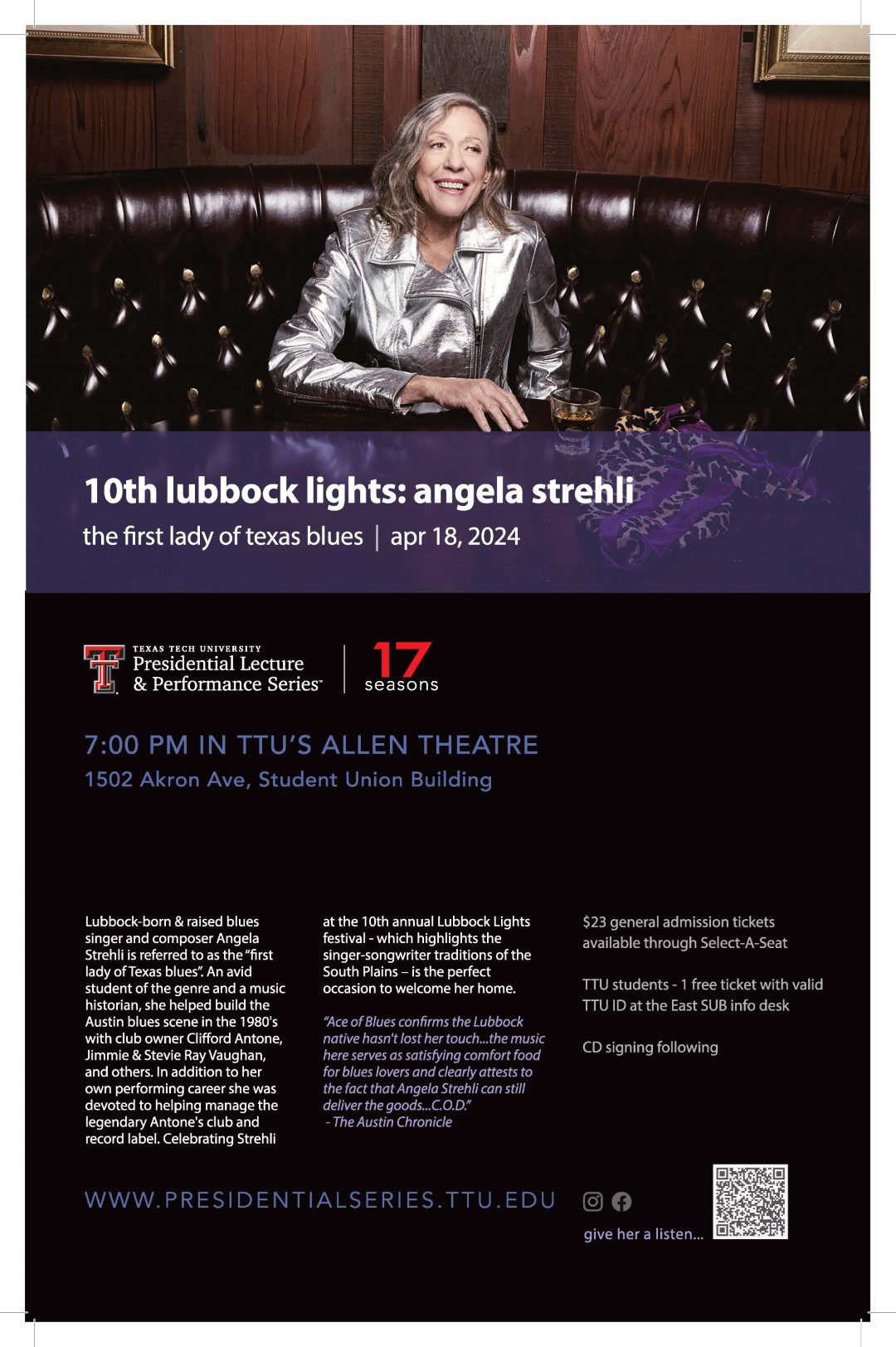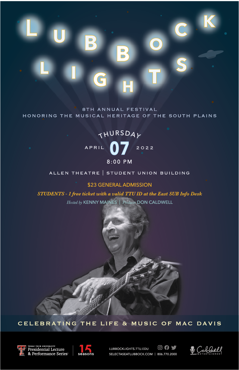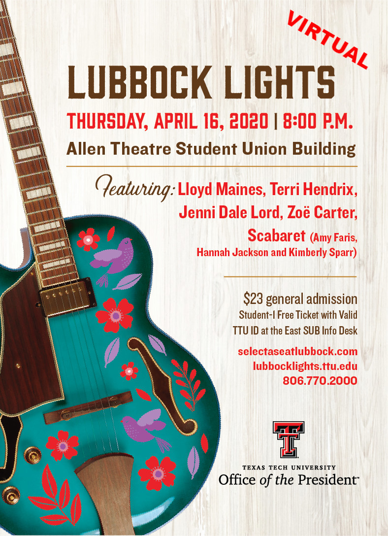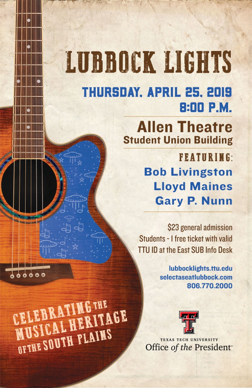 In the spring of 2015, regional artists Wade Bowen, Butch Hancock, Terri Hendrix and Lloyd Maines paired up with Texas Tech University to launch an event series called “Lubbock Lights: Celebrating the Musical Heritage of the South Plains.” The event, sponsored by the Office of the President and conducted by the Presidential Lecture & Performance Series, features discussions and performances by local and regional musical artists and gives attendees an inside look at the creative processes and inspirations that go into each artist's work. The weeklong festival consists of the participating artists visiting dozens of classrooms to discuss their process & offer insights to students within & outside TTU and culminates in a concert accessible to all on the Allen Theatre stage in the TTU Student Union Building on campus.